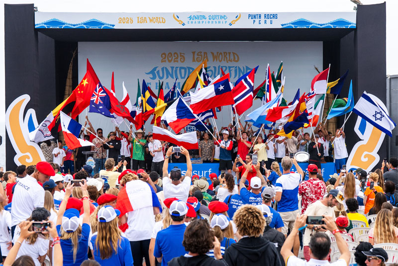 Participantes de un récord de 57 equipos nacionales conforman esta enorme cifra. Miembros de cada nación participaron en la tradicional ceremonia de las Arenas del Mundo de la ISA, vertiendo arena de sus playas de origen en un mismo recipiente como símbolo de la unión pacífica de las naciones del mundo a través del surf.